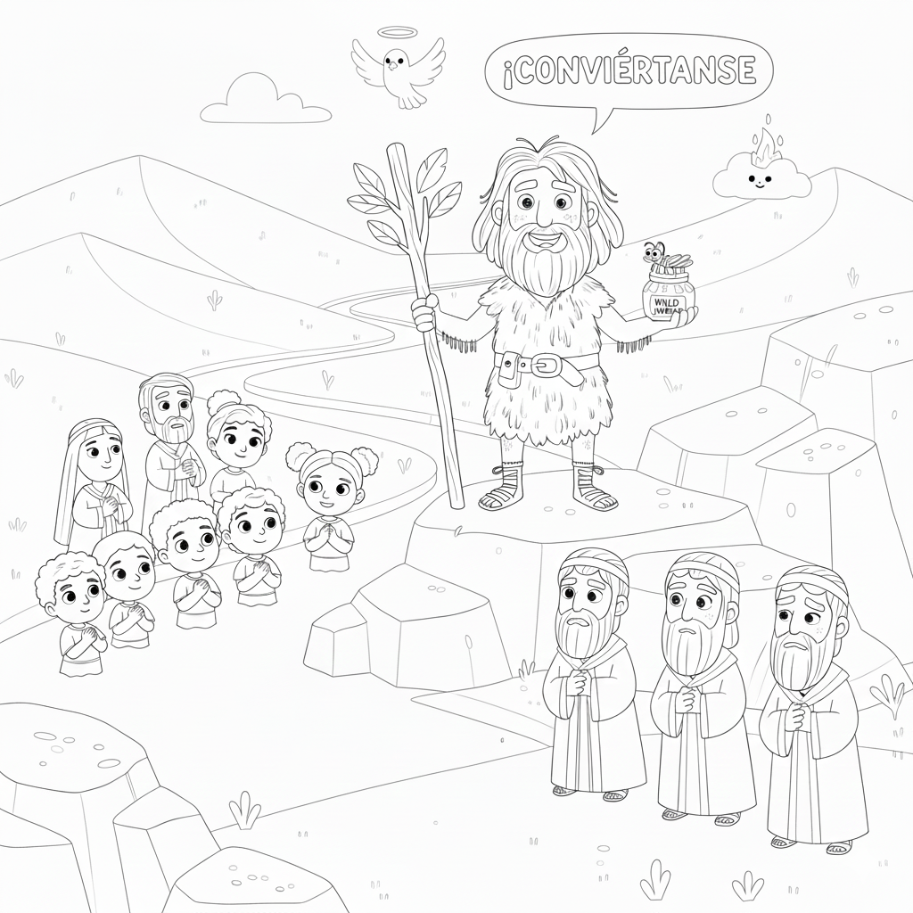 Actividad de catequesis para niños acerca del tema del Adviento, basada en la figura de Juan el Bautista. Incluye lectura bíblica, actividad y dibujo para colorear.